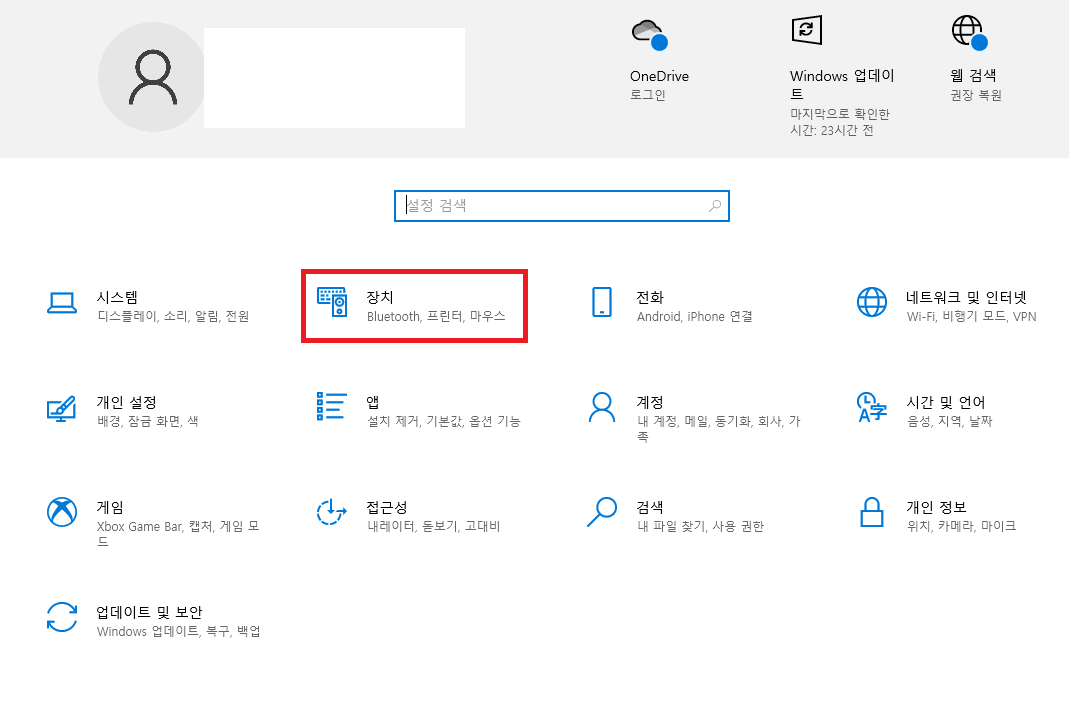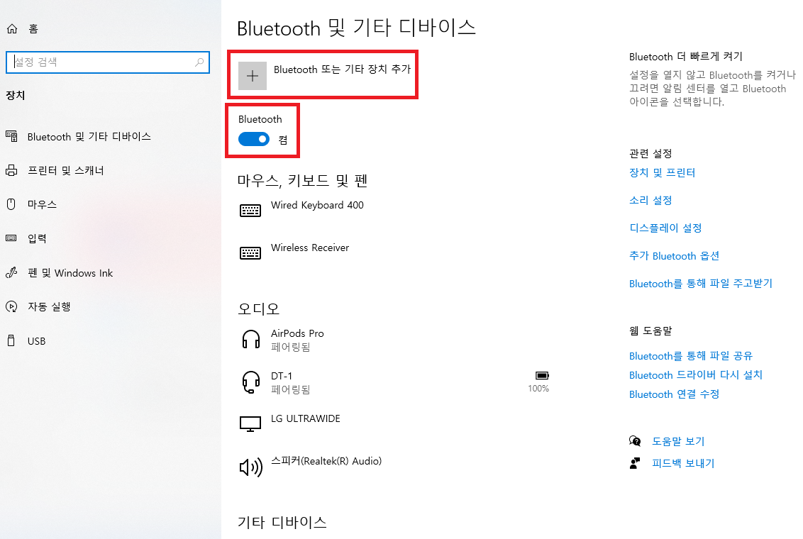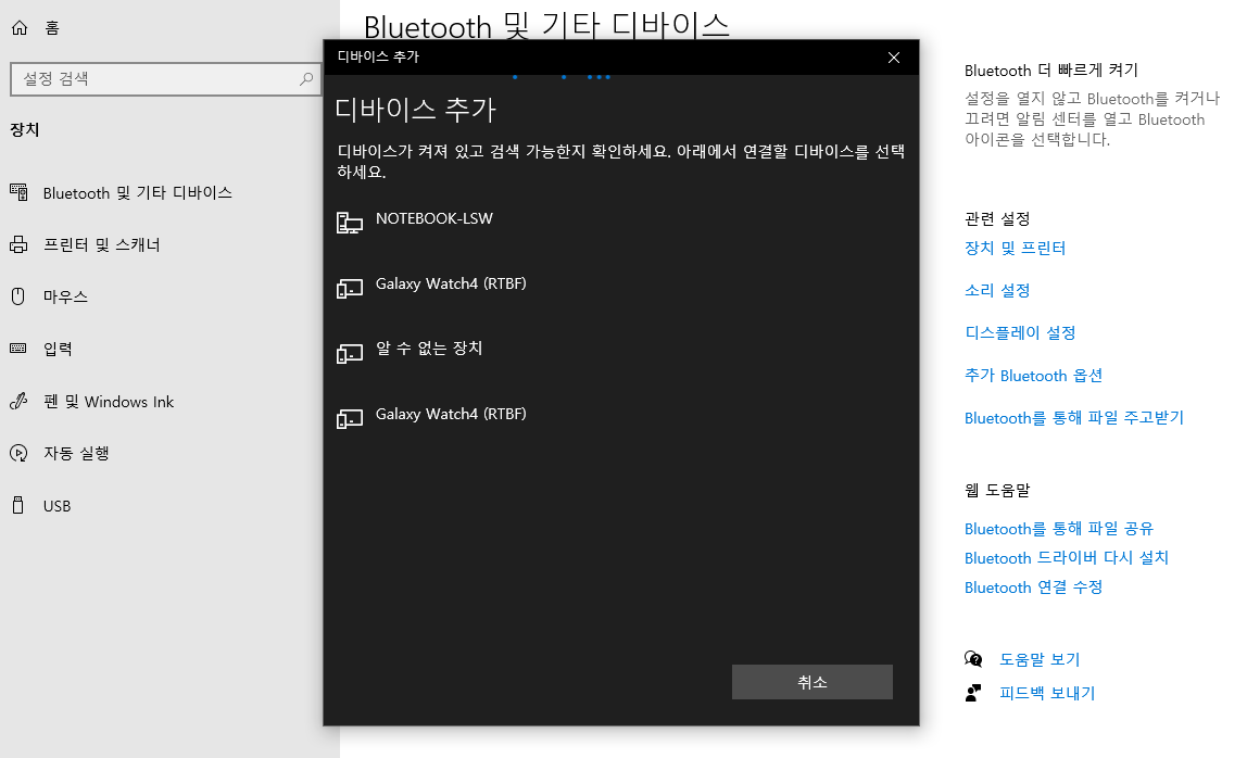 설정 → 장치 → 블루투스 또는 기타장치 추가 → 블루투스 → 기기이름 확인 후 연결