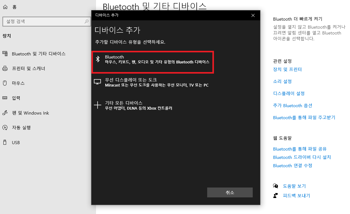 설정 → 장치 → 블루투스 또는 기타장치 추가 → 블루투스 → 기기이름 확인 후 연결